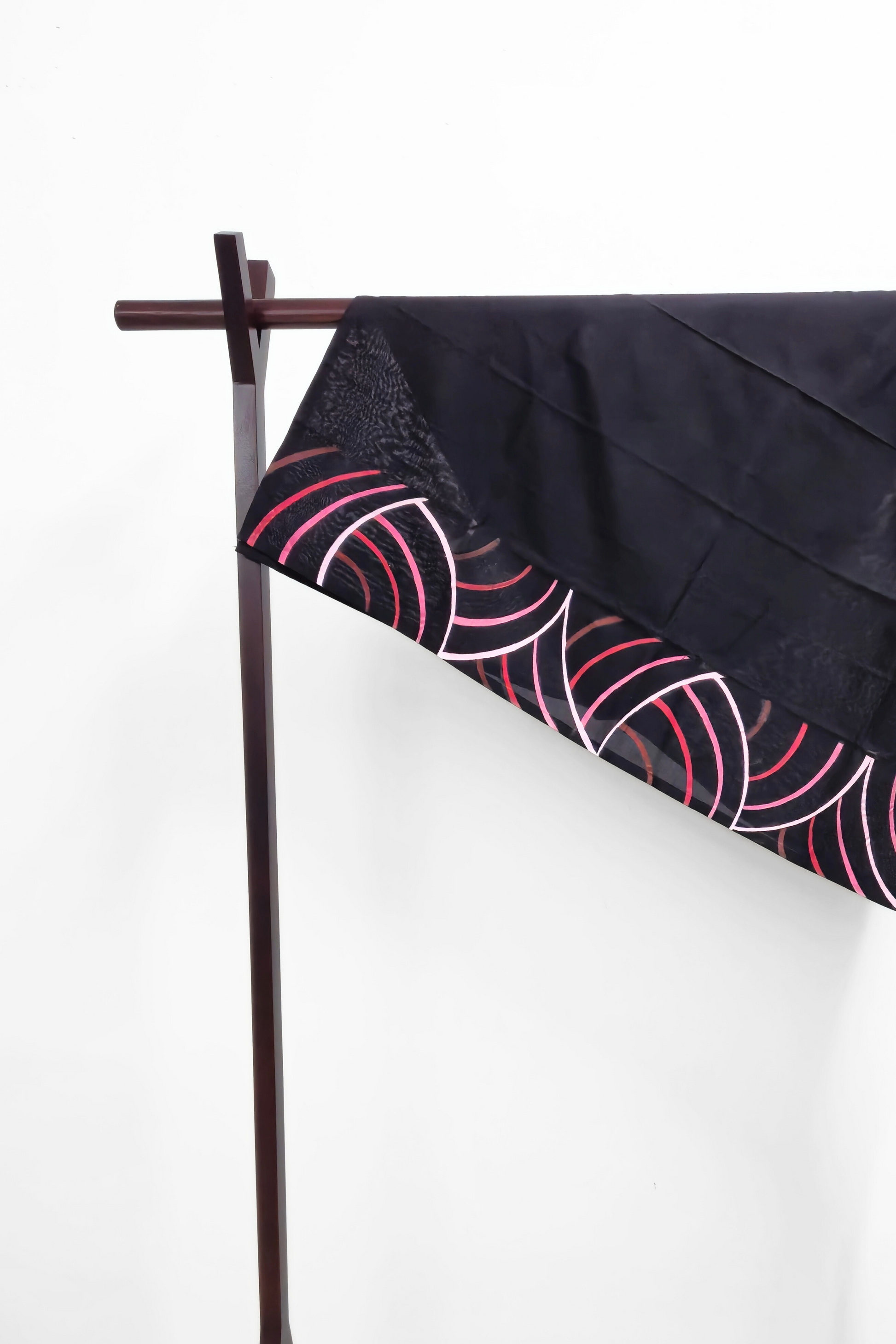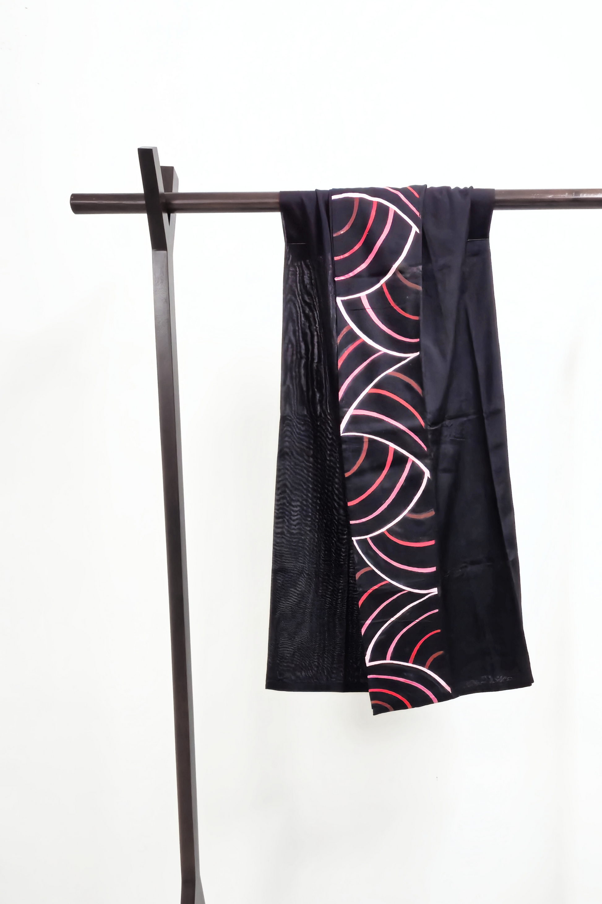This black lungi is a striking expression of bold design and intricate art, featuring shaded magenta circular lines that echo ripples in motion. The deep black base brings contrast and depth, while the vibrant magenta adds a sense of quiet drama and elegance. Pair it effortlessly with a soft neutral or white top for a look that blends contemporary flair with classic style.